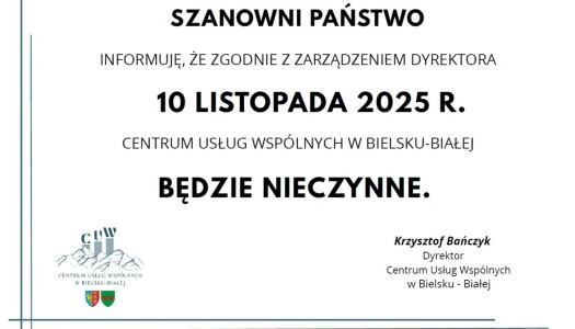 SZANOWNI PAŃSTWO, INFORMUJEMY, ŻE ZGODNIE Z ZARZĄDZENIEM DYREKTORA 24 GRUDNIA 2024 r. CENTRUM USŁUG WSPÓLNYCH BĘDZIE NIECZYNNE...